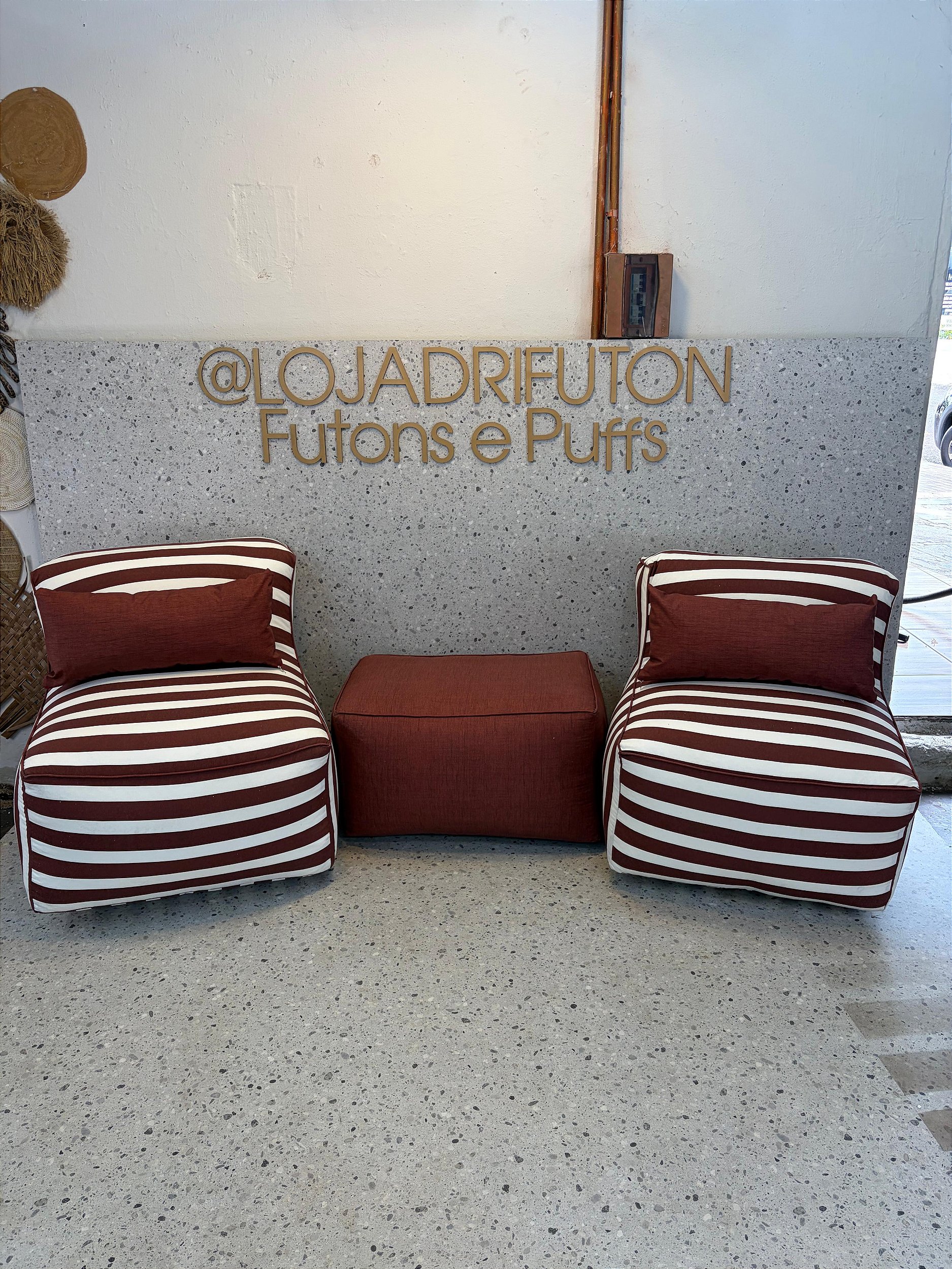 Conjunto Puff P Standard + 1 Peseira + 2 Almofadas Vinho Listrado