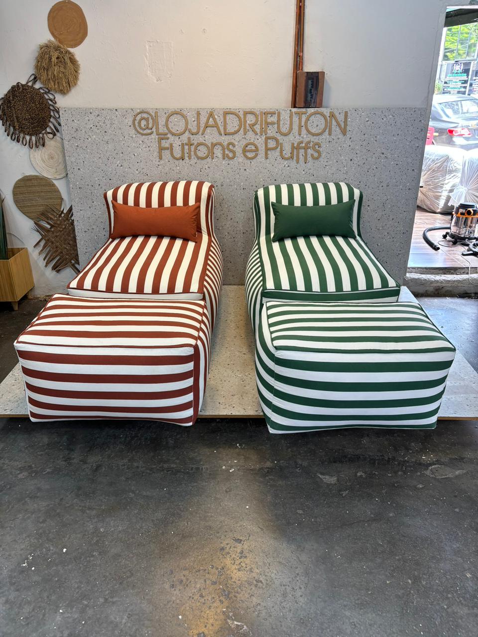 Conjunto Puff G Standard + 2 Peseiras + 1 Almofada cor listrado verde e listrado terra cota